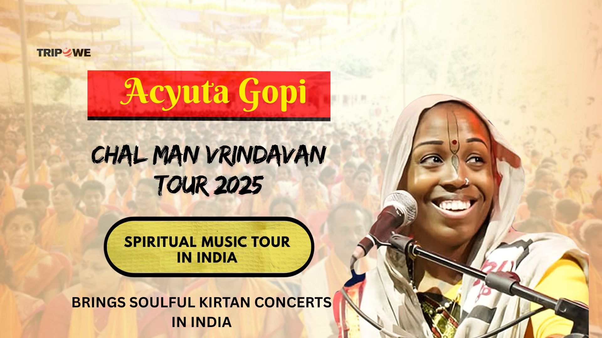 It’s a spiritual music tour in India 2025 where Acyuta Gopi performs live kirtans, devotional songs, and mantra chanting across major cities like Indore, Delhi, Jaipur, and Kolkata.